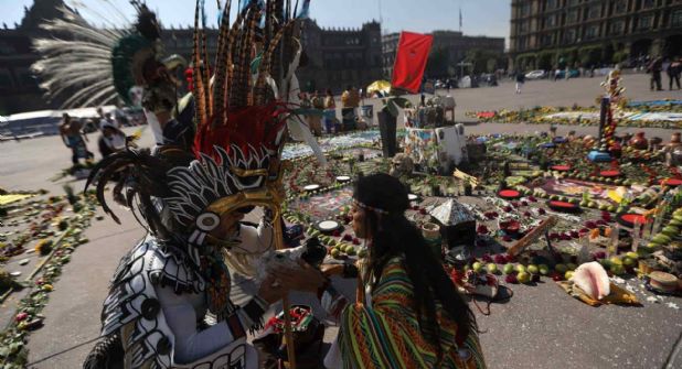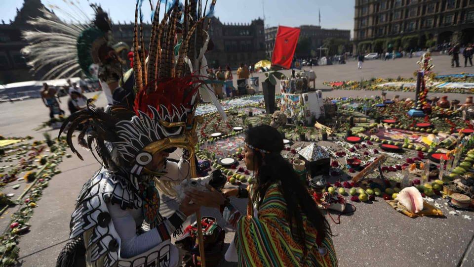 "Es el momento, estamos en tiempo de volvernos a unir", dijo Tonawaka Kwauhtlinxan, quien vestía un traje tradicional mientras participaba en una ceremonia de ofrenda y danzas para "abrir los rumbos y pedir permiso a las energías de los lugares" para poder iniciar la jornada de conmemoración.