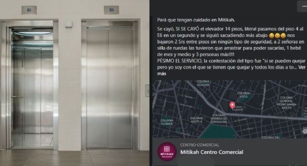 La usaría con el nombre de Ale Arriola informó que el elevador cayó súbitamente del piso 4 al estacionamiento en el sótano con el numero E6, cayendo así 14 pisos sin ningún tipo de seguridad para evitarlo. Con la usuaria iban bebés y personas en sillas de ruedas.