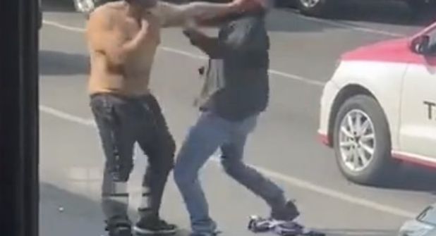 En el video se observa a un hombre de playera negra y a otro sin playera lanzarse puños y patadas mientras dan vueltas alrededor del otro, esto junto a un taxi con la puerta abierta, por lo que suponemos que uno de ellos era el conductor del taxi.