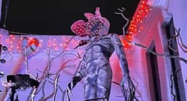 En el balcón se encuentra un terrorífico demogorgon con su boca llena de dientes afilados, en la parte posterior de la casa se observa a un Vecna entre dos árboles, y por encima de la cochera Max (personaje de la serie Stranger Things) se eleva en el aire.