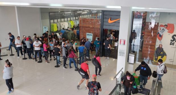 Incluso, los empleados y administradores de la plaza colocaron una carpa para que las personas se formen y esperen hasta 50 minutos para ingresar a la tienda donde se vende artículos deportivos, principalmente tenis.