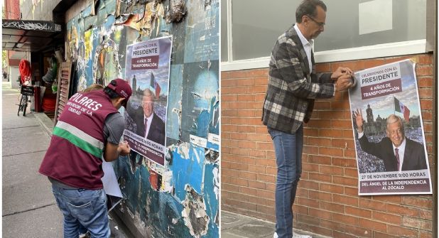 Estos días previos a la marcha del presidente, usuarios de redes sociales, han compartido imágenes y videos de trabajadores del gobierno de la Ciudad de México pegando volantes propagandísticos sobre la marcha del presidente de este domingo 27 de noviembre.