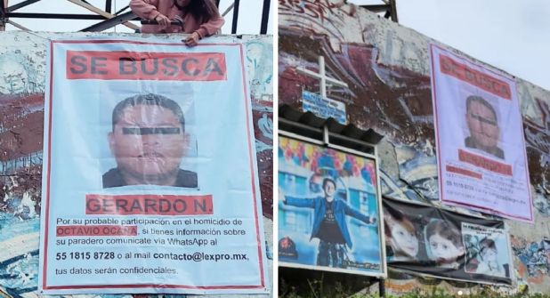 “Se busca a Gerardo “N” por su probable participación en el homicidio de Octavio Ocaña, si tienes información sobre su paradero” es el texto que se lee en una manta colocada justo en el lugar donde se impactó la camioneta del actor.