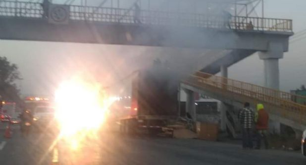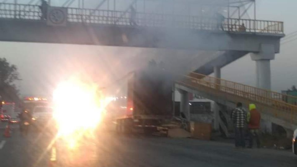 El accidente se suscitó poco antes de llegar a la caseta de Tepotzotlán, sin que llegarán oportunamente los bomberos para sofocar el incendio de la pesada unidad, que se quemó casi totalmente.