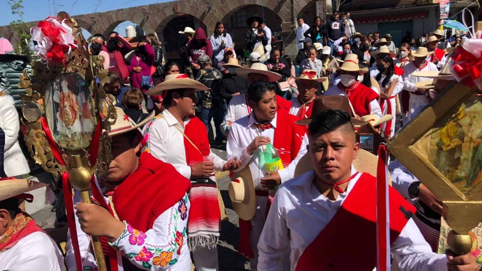Con cánticos donde se cuentan las hazañas de quienes salían de sus comunidades para arriar materiales, semillas y carbón a otros estados, los danzantes, portando un traje con bordados otomíes, celebran que sigue de pie su tradición.