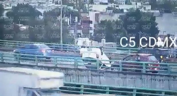 El Centro de Comando, Control, Cómputo, Comunicaciones y Contacto Ciudadano (C5) publicó un video en el que se observa un vehículo color blanco que se volteó por completo y quedó sobre el toldo, justo al filo de la valla de contención del Segundo Piso del Périférico.