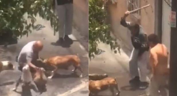 En el contenido es posible observar a un hombre en el suelo intentando defender a su mascota de los otros perros quienes lo rodean y tiran mordidas.