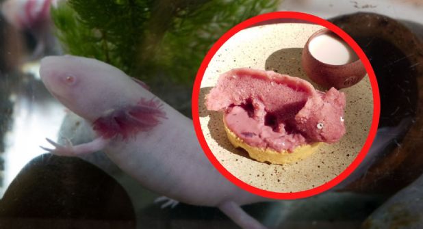 Tiene todos los detalles de un ajolote, ojitos, su característica sonrisa, las branquias externas plumosas, las patas posteriores y delanteras y su inconfundible aleta dorsal de renacuajo. Una forma que podría considerarse arte culinario.
