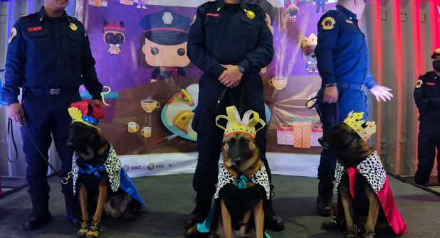 Los perritos de la Unidad Canina hicieron de lado, por un momento, sus actividades en la corporación, que consisten en la detección de explosivos, así como de sustancias prohibidas o peligrosas, para dar alegría a los pequeños.