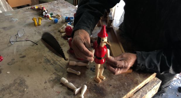 Le llegan pedidos de más de 100 piezas, pero una sola la vende en 165 pesos porque cada uno de estos muñecos de Pinocho, le cuestan 10 días de trabajo. Todo lo hace a mano, incluso es su esposa quien los pinta para dejarlos perfectos.