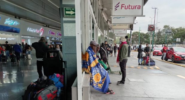 La situación es similar en otros puntos de la Ciudad de México donde hay asentamientos de personas migrantes: se abrigan con lo poco que tienen, como ocurre afuera de la Central de Autobuses del Norte.