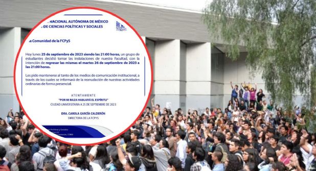 Alrededor de las 07:00 horas de este lunes 2 de octubre, un grupo de estudiantes tomó las instalaciones de la Facultad de Ciencias Políticas y Sociales de la UNAM, por lo que las clases se suspendieron. De acuerdo con un comunicado interno de la UNAM, el grupo anunció que liberarán la sede la noche de este mismo lunes.