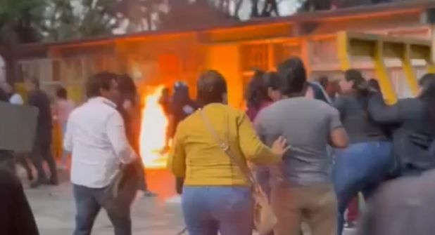 En un segundo video se ve a dos encapuchados vandalizando las instalaciones del plantel con pintura en aerosol color rosa y morado con la frase “Te quedó grande el puesto Paty”.