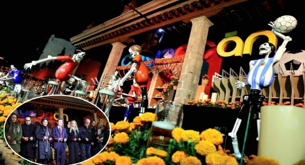 Hilda Trujillo describió la composición de esta ofrenda resaltando la representación de los dos estadios monumentales más importantes del país: el Estadio Azteca, sede de los mundiales que marcaron la historia del fútbol y el Estadio Olímpico Universitario, sede de los Juegos Olímpicos de 1968, que es una joya arquitectónica y artística considerada Patrimonio de la Humanidad.