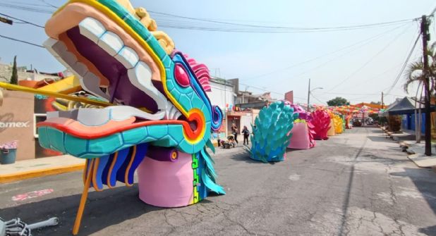 "Este año damos un giro total, porque las deidades prehispánicas son parte importante de la cultura de muertos. Y esta vez quisimos representar a Quetzalcóatl porque es dios de vida, dios de muerte", explica Raymundo Jean, miembro de Jean Cartonería.