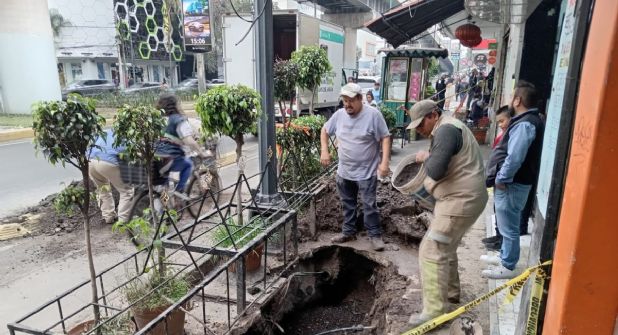 Afuera del salón de belleza hay un socavón por las reparaciones de una fuga de agua que se desató por los movimientos en el suelo.