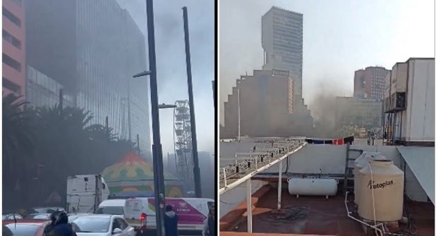 En redes sociales circulan imágenes del edificio localizado sobre avenida Paseo de la Reforma pasando Hotel Barceló, rumbo a Insurgentes; siendo consumido por las llamas, mientras se eleva una gran columna de humo.