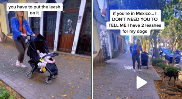 Fue la usuaria de TikTok identificada como Dulcemelodia Cantu quien compartió el video en donde se puede ver cómo la mujer, aparentemente de Estados Unidos, va caminando y empujando una carriola mientras dos canes la siguen.