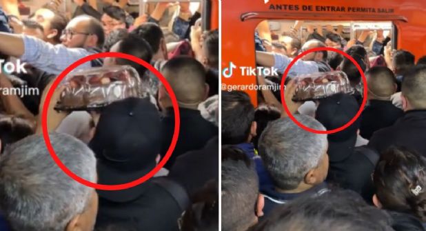 Un hombre que se encontraba esperando abordar el convoy dejó con gran preocupación a miles de usuarias y usuarios de TikTok, pues en el video se observa que lleva un pastel de chocolate sólo protegido con su envase tradicional. El hombre esperaba pacientemente a que el tren del Metro se despejara un poco para poder subir; sin embargo, el escenario no era nada esperanzador, pues los ríos de gente entrando y saliendo no paraban.