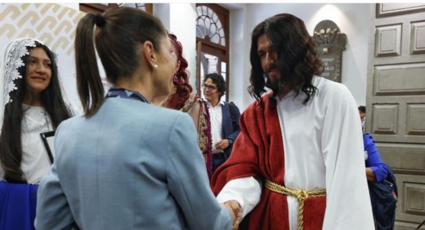 Aunque la jefa de Gobierno se tomó fotografías con todo el equipo que participará en la representación y las subió a sus redes sociales, resalta en la que se ve a Jesucristo, vistiendo su toga blanca con rojo, saludándola estrechándole la mano, ante la vista de la virgen María. En los comentarios, los usuarios hicieron alusión a que Sheinbaum Pardo está recibiendo ayuda divina, bromeando con los personajes que la acompañaron.