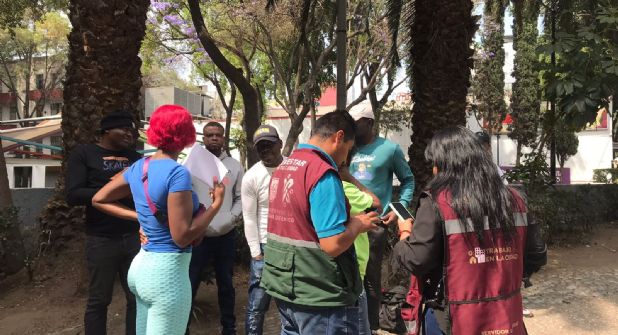 Eran las 10am y el parque Giordano Bruno lucía casi desierto. Sólo había algunos empleados de la Secretaría de Bienestar Social, trabajadores de limpia y algunos vecinos que por ahí pasaban. Algo diferente a la concentración que había de 450 migrantes, de acuerdo con un comunicado de la Sibiso, hasta la madrugada de este 10 de abril, que llevaban unas semanas asentados en el parque, por la cercanía que el lugar tiene con la Comisión Mexicana de Ayuda a Refugiados (Comar), en la calle de Versalles, a dos cuadras.