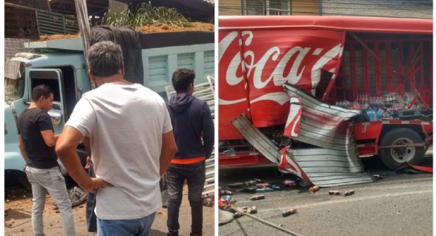 Huixquilucan, Estado de México.- Un camión materialista cargado con tierra para relleno se quedó sin frenos y se impacto con al menos seis vehículos, uno de ellos un camión de Coca-Cola, este miercoles 26 de abril en el municipio de Huixquilucan, en el Estado de México.