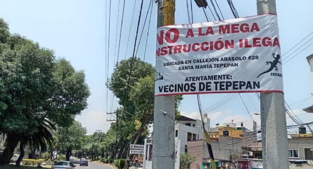 Al caminar por el Callejón de Abasolo se puede apreciar la estructura de uno de los edificios pero no hay trabajadores laborando. Es esa misma obra detenida la que ha motivado a que varios vecinos del pueblo de Santa María Tepepan se organicen para frenar la construcción.