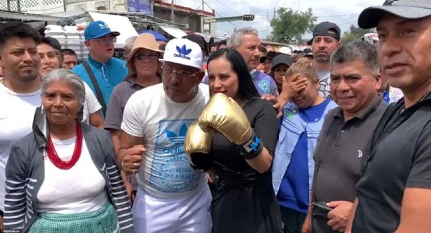 Fue ahí donde la alcaldesa se puso unos guantes dorados y se puso en guardia, lista para el combate. "Parafraseando a 'el Rey' Martínez: es con todo y menos con miedo, con quien sea y donde sea", enfatizó Sandra Cuevas, rodeada por habitantes de Tepito.