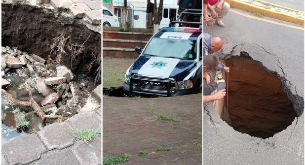 El argumento de las autoridades locales es que la camioneta TS-12 de la Policía Municipal fue colocada allí para resguardar la zona reblandecida, pero se venció el piso y por eso es que se precipitó parcialmente.