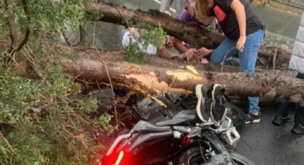 El accidente ocurrió esta tarde después de las 16:00 horas cuando un joven circulaba en su motocicleta en avenida Jiménez Cantú, al lado del nuevo “deprimido vial” inaugurado apenas hace unas horas por las autoridades locales, cuando un árbol de unos 20 años cayo repentinamente sobre el joven.