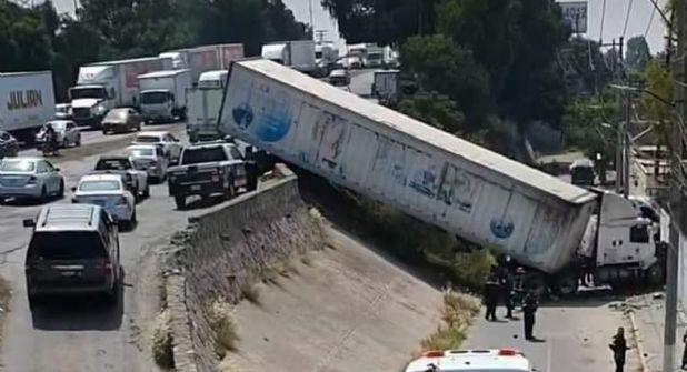 El tráiler con caja seca permanece en el lugar desde antes de medio día, obstruyendo parcialmente la Vía Reyes Heroles, la cual conecta con la carretera México-Querétaro, una de las principales vialidades del Valle de México y punto de ingreso de la zona centro del país.