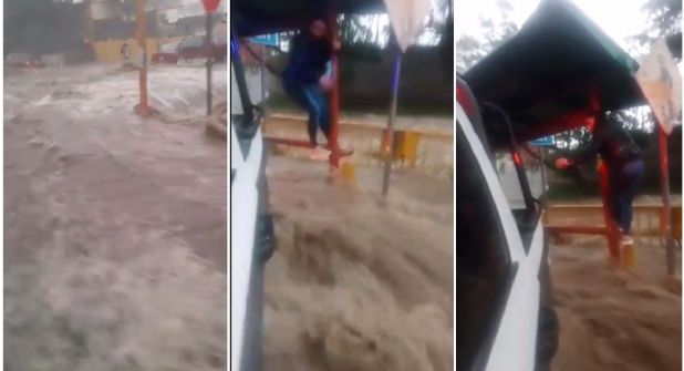 La lluvia sorprendió a una mujer joven que en un paradero esperaba el transporte público, que debido a las corrientes optó por sujetarse de un tubo del paradero para evitar caer al agua que se arremolinaba en ese lugar.