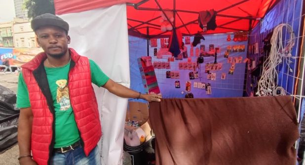 Ante la falta de un trabajo e ingresos, Fuisnel, uno de los cientos de migrantes haitianos que alberga la Plaza Giordano Bruno, emprendió un pequeño negocio de artículos para celular en medio de la explanada de la Colonia Juárez.