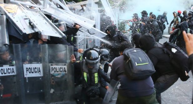 Mientras tanto, elementos de la policía de la CDMX se protegen de las agresiones lanzadas por manifestantes que participan en la movilización por el 56 aniversario de la matanza de estudiantes en Tlatelolco en 1968, ocurrida durante el gobierno de el gobierno de Gustavo Díaz Ordaz.