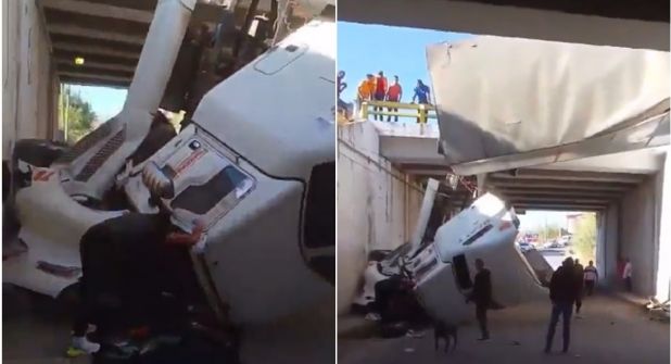 El hecho quedó registrado en video, mismo que se difundió en redes sociales. En el video se observa cómo quedó la cabina del tráiler, color blanco, tras caer del puente.