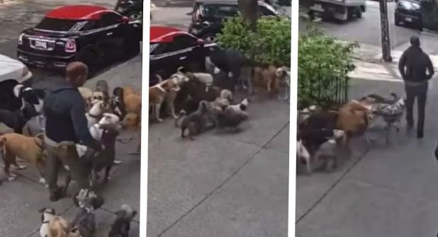 En la grabación, que dura poco más de dos minutos, se muestra al paseador de perros manejando a más de 20 caninos a su cuidado. En medio de la dificultad para transitar con tantos animales, se enfrenta a un enredo de correas.