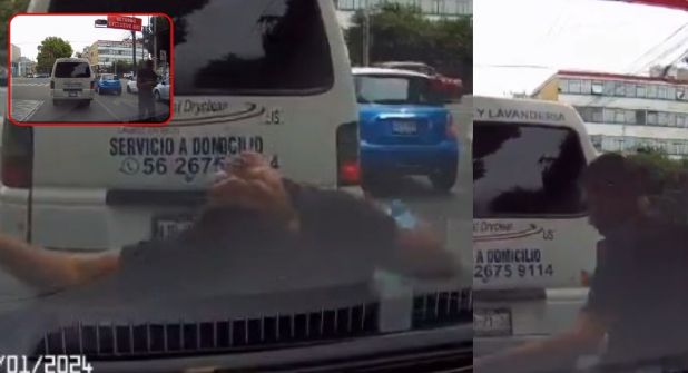 El “limpiaparabrisas” sigue golpeando el vehículo mientras el conductor le dice que él no lo aventó. En ese momento se pone el semáforo en verde y el conductor da marcha mientras deja al sujeto gritando y reclamando.