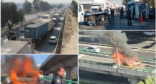 Tepotzotlán, Estado de México.- el incendio de dos tráilers y un vehículo, la volcadura de una camioneta y un choque por alcance a la altura de la Ford ocasionan este día filas kilométricas en la carretera México-Querétaro y su continuación en el segundo piso del Periférico Norte.