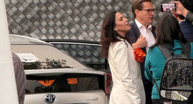 El emecista fue el primer candidato en llegar a las instalaciones de MVS, donde se realizará el Debate, en un automóvil marca Toyota con placas 02F-040 en compañía de su esposa.