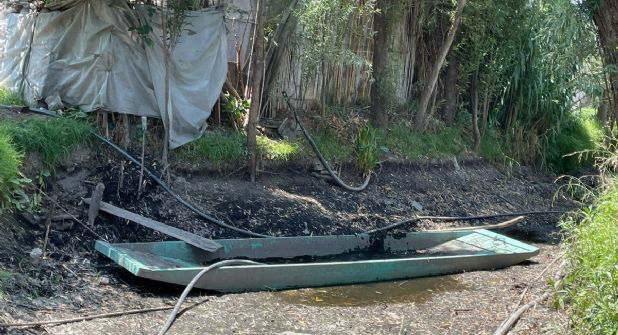 Juárez muestra otro canal, más ancho y donde incluso se ve una canoa, destinada a no avanzar mientras no haya agua. Es en el paraje de Acayapan. Ahí la parte donde había agua es más ancha y profunda y no está como otros canales, donde ya hay pasto crecido e incluso quién no sabe cree que ahí no había agua hace poco.