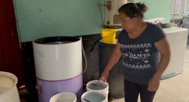 “Esto es lo que yo reciclo para mi baño, para mi patio, apenas hoy me pasaron a dejar (en pipas)", comentó Angélica, quien incluso tiene que almacenar agua en su lavadora ante la falta de una cisterna.
