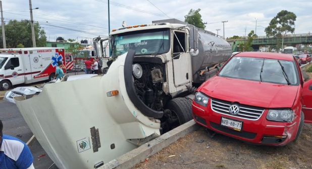 De acuerdo con los reportes preliminares, el accidente en la Avenida Central ocurrió cuando la pipa de agua impactó a tres vehículos particulares, sobre los carriles de alta velocidad.