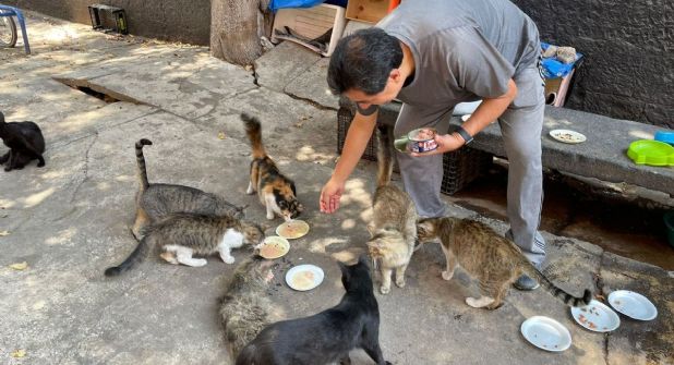 Cuando llega, se ve sólo a un par de gatos detrás de una reja. Pero conforme empieza a sacar los platitos y las latas de alimento y algunas bolsas de croquetas, se van acercando algunos más. La mayoría son ariscos, pero otros no tienen empacho en ponerse entre los pies del visitante, como si lo conocieran de toda la vida.