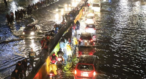 En videos que circularon en las redes sociales, se observa que una dila de conductores que tuvieron que cruzar el bajo puente por el carril de la izquierda para evitar que el agua dañara el funcionamiento de sus autos.