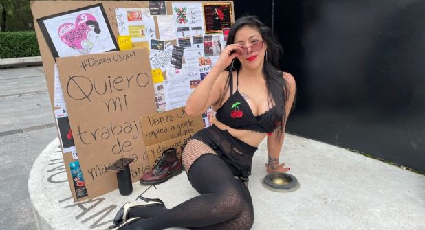 Una de sus pancartas tenía el mensaje de ‘Quiero mi trabajo de baile’, y otra ‘La UNAM despide artistas creativas y mujeres profesionales’ las cuales mostró mientras hacía unos pasos de baile.