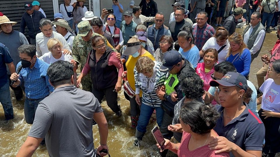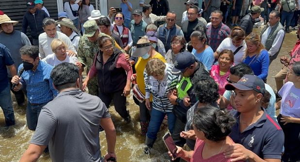 La gobernadora del Estado de México, Delfina Gómez, recorrió calles afectadas por las inundaciones de aguas negras en el municipio de Chalco, acompañada de decenas de afectados.