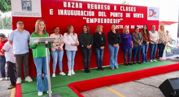 Mary Gómez, presidenta honoraria del Sistema Municipal DIF de Tlalnepantla de Baz, Estado de México, inauguró el Bazar de Regreso a Clases e instaló el punto de venta “EmprendeDIF”, el cual tiene por objetivo proporcionar a las nuevas emprendedoras de un lugar para promocionar y vender sus productos, impulsando su autonomía y la confianza en sí mismas.