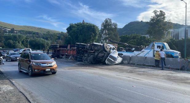 Otro tráiler volcó en la autopista México-Querétaro a la altura del panteón Jardines del Recuerdo en Tlalnepantla, estado de México. El viernes un tráiler volcó en esa misma curva y dejó detenida la vialidad por más de 3 horas.