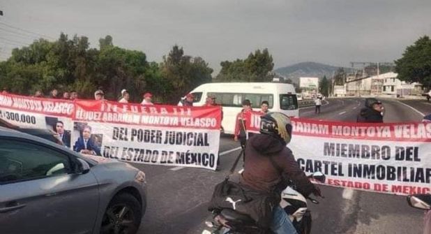En el lugar colocaron lonas donde acusan a un juez del penal de Chiconautla, de tomar una decisión afectando sus intereses al inclinarse en favor de una persona con quién se concretó el despojo de un terreno en Santa Clara.