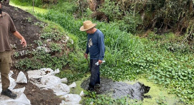 Más adelante, Ricardo se pone en medio de un canal ancho pero raquítico. En medio hay tierra y no llega el agua, a los lados sí, pero a un bajo nivel, si acaso unos 10 centímetros. Para probarlo mete los pies y una varita. Esa agua, producto de las lluvias, es oro para ellos.